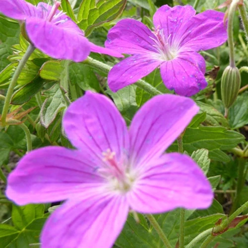 Dans le monde foisonnant du Géranium des marais, plusieurs variétés se distinguent, chacune arborant ses propres atouts comme autant de joyaux dans une couronne. Premièrement, le Geranium palustre ‘Summer Skies’ séduit avec ses fleurs doubles d’un bleu pâle presque céleste, une variante douce qui contraste avec la teinte pourpre plus commune. Ensuite, le ‘Crystal Lake’ fait tourner les têtes grâce à ses splendides fleurs d’un bleu lavande rafraîchissant, rappelant les eaux sereines d’un lac alpin au clair de lune. Il y a également le ‘Plenum Violaceum’, une variété qui joue une symphonie de couleur en exhibant des fleurs doubles dans des tons de violet profond, donnant l’impression d’un petit bijou parmi les feuilles vertes. Puis, le ‘Rosemoor’ tient sa réputation de ses fleurs d’un rose tendre, ajoutant une douceur romantique aux espaces naturels ou aux jardins. Enfin, le ‘Black Beauty’ offre un spectacle dramatique avec ses feuilles sombres presque noires et ses fleurs d’un rose pâle, créant un contraste visuel saisissant qui attire indéniablement le regard.
