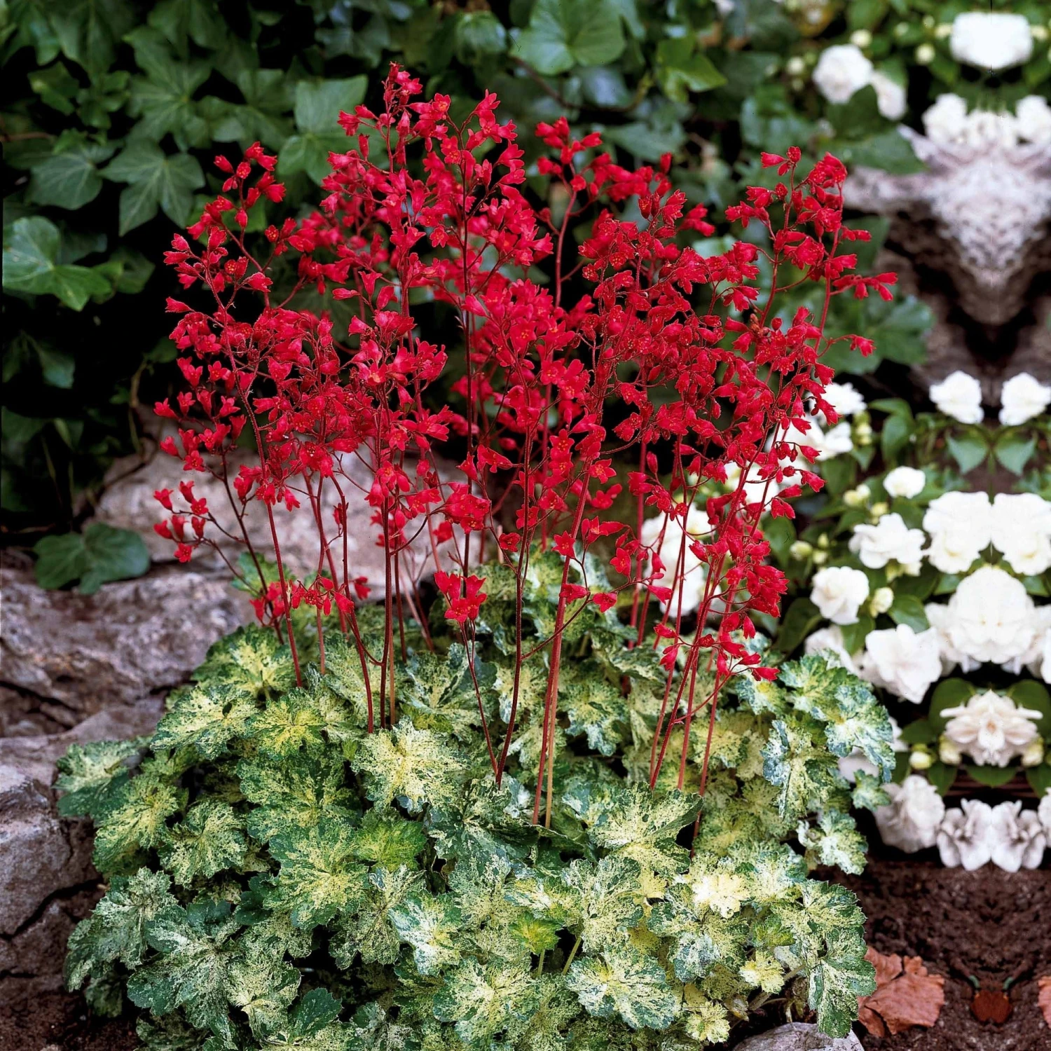 Apportez plus de couleur et de texture à votre jardin toute l’année avec les plantes vivaces Heuchères hybrides Hercules. Cette variété se démarque par leurs fleurs rouge sang particulièrement portées par de longues tiges. Son feuillage semi-persistant vert tacheté de blanc formant un coussin dense au pied lui procure également un charme exceptionnel.
