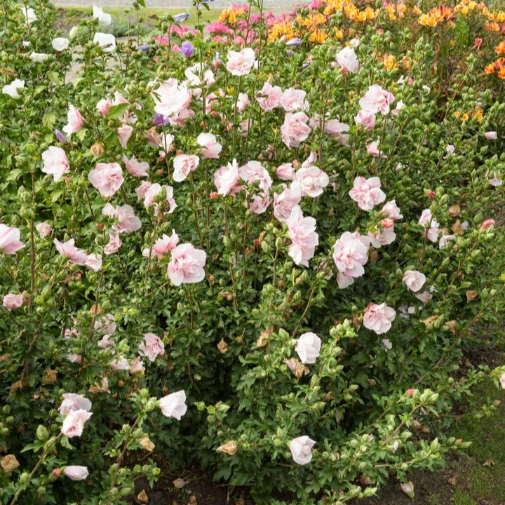 Hibiscus Syriacus Pink Chiffon (Althéa) fleurit avec des fleurs duveteuses. La floraison vigoureuse rendra votre jardin rempli à ras bord de fleurs roses en dentelle tout l’été. Idéal en spécimen unique ou en haie fleurie