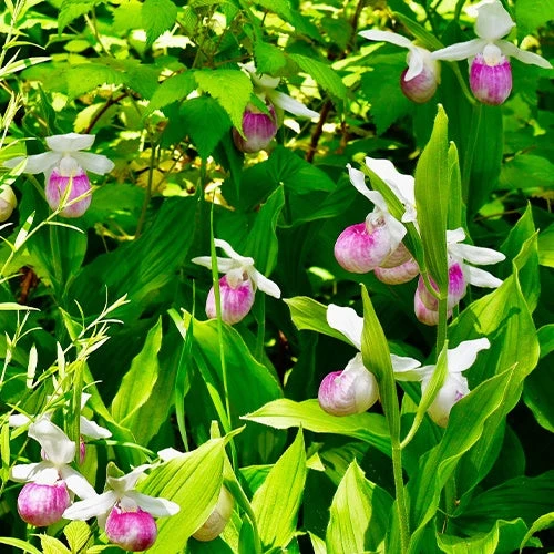 Vous connaissez certainement le sabot de Vénus. Voici un superbe cultivar qui résiste jusqu’à -30°C Elle fleurit en proposant une belle hampe florale. Ses multiples fleurs aux sépales et pétales blancs et labelle renflé rose fort sont tout simplement magnifiques. Son feuillage est vert et allongé.
